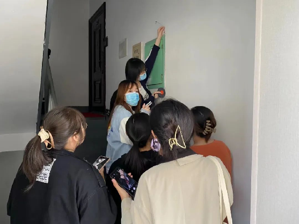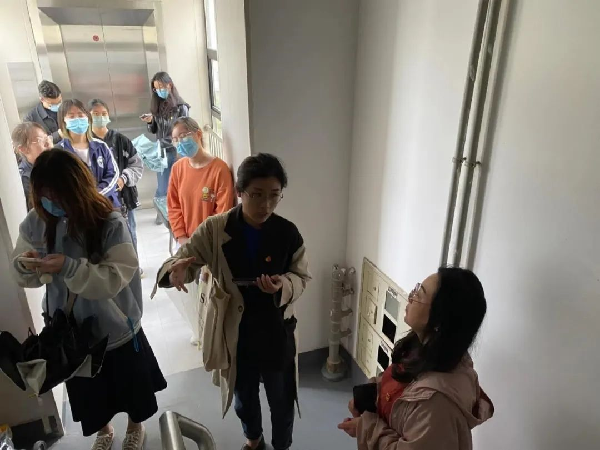 合庆镇庆华居民区党总支书记张宇华、党总支副书记陶晓晨向师生介绍了庆华居民区的整体情况及老旧小区惠民工程电梯加装项目的背景与历程,展示了基层社区管理的真实样貌。随后,双方共同实地考察了云舒苑25号楼加装电梯使用情况,全面了解电梯空间布局、居民年龄层次等实际情况,并对空间尺寸进行测量和记录。交流过程中,同学们根据自身所学专业积极思考、大胆创新,基于文化传播的基本理论提出了切实可行的“梯”升实施方案,为后续的项目实施奠定了坚实基础。
