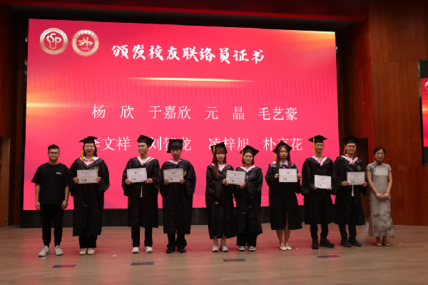 毕业班辅导员薛志鹏、衡元元、杨立为毕业生代表颁发员工联络员证书