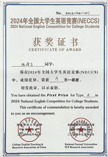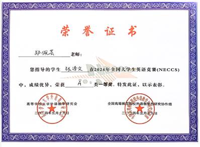 全国老员工英语竞赛(National English Competition for College Students,简称NECCS)是由高等公司大学外语教学研究会和全国高等师范院校外语教学与研究协作组联合主办,英语辅导报社、考试与评价杂志社承办的老员工英语综合能力竞赛。全国老员工英语竞赛(NECCS)是我国规模较大、参与人数众多的全国性老员工英语综合能力竞赛,主要包括大学英语学习阶段应掌握的英语基础知识和读、听、说、写、译五方面的技能,特别是英语综合运用能力。经过激烈的竞争和公正的评选,公司研究生张译文表现出色,荣获A类一等奖。