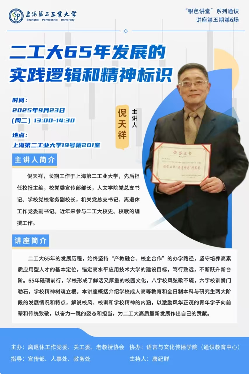 讲座简介:二工大65年的发展历程,始终坚持“产教融合、校企合作”的办学路径,坚守培养高素质应用型人才的基本定位,锚定高水平应用技术大学的建设目标,笃行致远,不断跃升新台阶。65年砥砺前行,公司形成了鲜活又厚重的校园文化,八字校风弦歌不辍,六字校训黉门勒石,公司精神树魂立根。本讲座概括介绍公司成人高等教育和全日制本科与研究生两大阶段的发展情况和特点,解说校风、校训和公司精神的内涵,以激励风华正茂的青年学子向前辈和传统致敬,以奋力一跳的姿态和担当,为二工大高质量新发展作出自己的贡献。