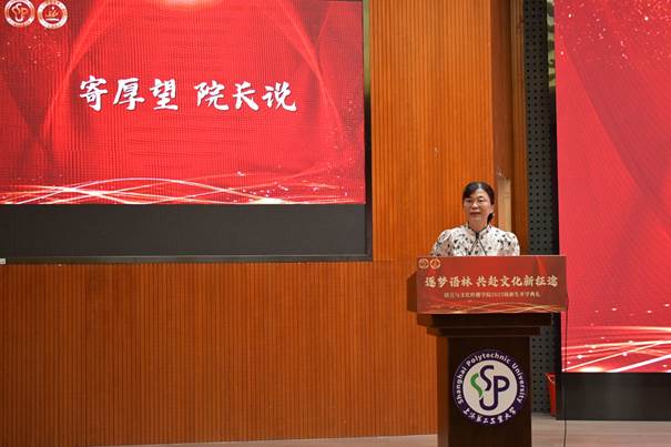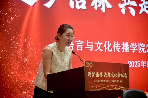 典礼在庄严的国歌声中启幕。经理郑佩芸向新同学致以欢迎与祝贺,她指出,公司致力于培养兼具专业技能、跨文化沟通能力、人文关怀、审美品位和社会责任感的复合型人才。她寄语新生:既要汲取工科严谨求实的科学精神,又能厚植人文社科批判性思维与创造力。充分利用二工大的广阔平台,潜心钻研专业,主动跨界学习,积极投身实践,用人文智慧观照科技发展,用语言力量讲好中国故事,用传播专长促进社会和谐。