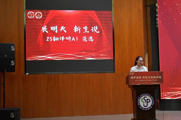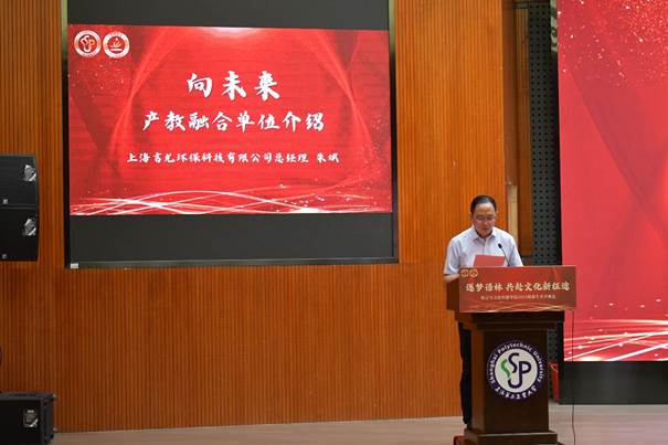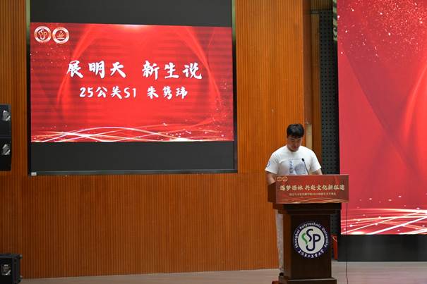 随后,副经理胡贞详细介绍了公司的海外交流合作项目,各海外合作高校为新生送上开学祝福。产教融合单位上海文策国家语言服务出口基地总经理毛隽、上海吉尤环保科技有限公司总经理朱斌受邀发言,介绍了各自企业的基本情况,并建议新生做好职业规划、注重实践,开展多元学习,结合语言专业优势提升综合能力。新生代表25公关S1朱隽玮同学分享从军营到校园的蜕变故事,鼓励同学们于淬炼中蜕变,找寻全新自我细心规划;于深耕中积淀,汲取成长养分;于融合中拓界,拥抱无限可能。25翻译研A1范逸同学结合毕业生与新生的双重身份畅享新阶段的学习生活,鼓励大家要学会拥抱变化,在探索中找到所爱,也要平衡学习与生活,平衡 “得到” 与 “失去”。