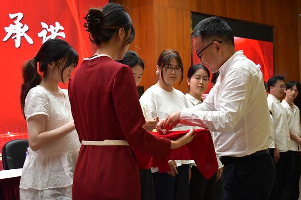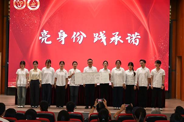 与此同时,在中国人民抗日战争暨世界反法西斯战争胜利80周年之际,公司也迎来了10位研究生员工党员,公司党委书记顾贤凯为他们授予党徽,勉励他们勇担使命。员工党员对党组织的郑重承诺,表示将永葆初心,筑牢信仰之基;笃学求真,恪守学术底线;勇担使命,践行服务宗旨,在新征程上锤炼过硬作风,为公司建设贡献青春力量。